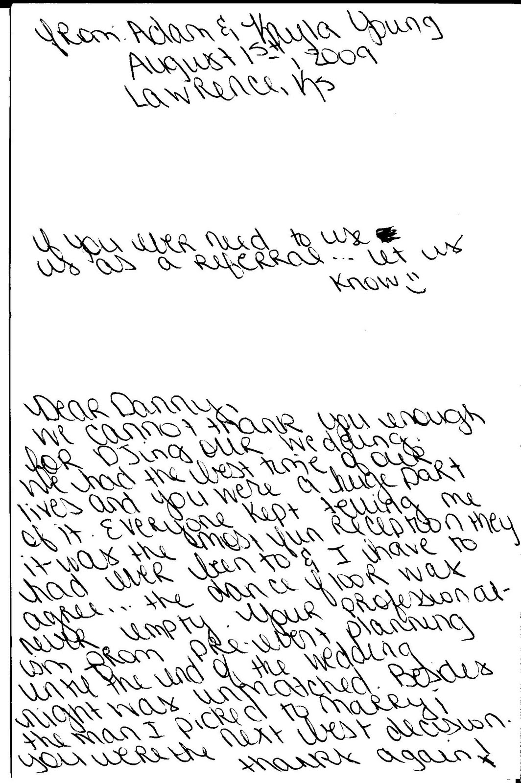 “ Dear Danny, We cannot thank you enough for DJing our wedding. We had the best time of our lives and you were a huge part of it. Everyone kept telling me it was the most fun reception they had ever been to & I have to agree…the dance floor was never empty. Your professionalism from pre-event planning until the end of the wedding night was unmatched. Besides the man I picked to marry, you were the next best decision thanks again! If you ever need to use us as a referral…let us knowJ.” From Adam & Kayla Young August 1st, 2009 Lawrence, KS